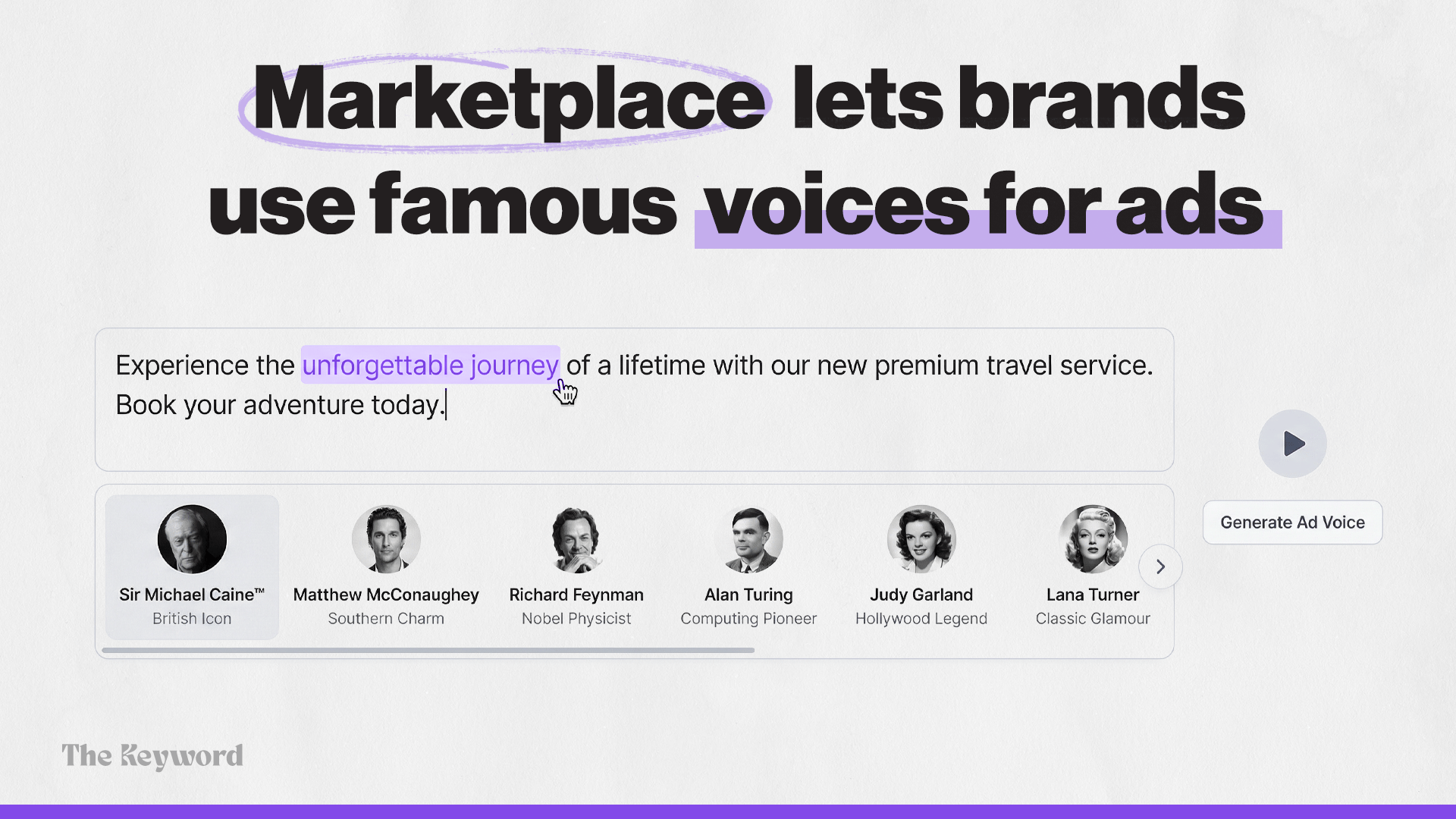 It opened with 28 voices, including Sir Michael Caine, Judy Garland, and Maya Angelou. Brands can apply to use AI voice replicas in ads, podcasts, audiobooks, and video, but every project needs sign-off from the talent or the rights holder.