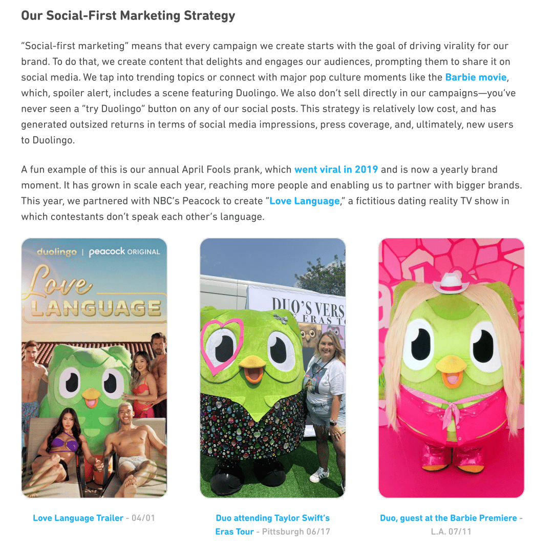 This write-up was included in their latest investor update and describes their focus on virality (not direct selling).